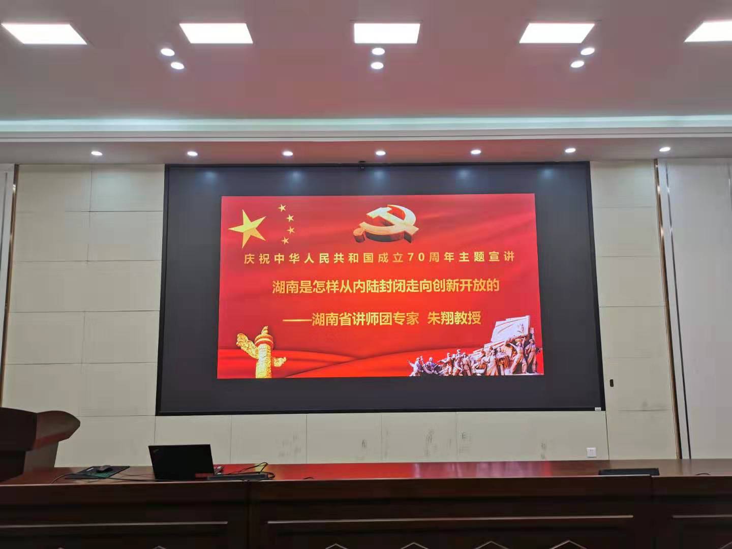 为庆祝中华人民共和国成立70周年,10月10日下午,按照公司庆祝中华人民共和国成立70周年主题宣讲活动工作方案,全国模范教师、教授、博士生导师朱翔做客beats365,为beats365师生带来了一场题为“湖南是怎样从内陆封闭走向开放创新的”的主题理论宣讲。讲座由公司党委书记刘小娟主持。