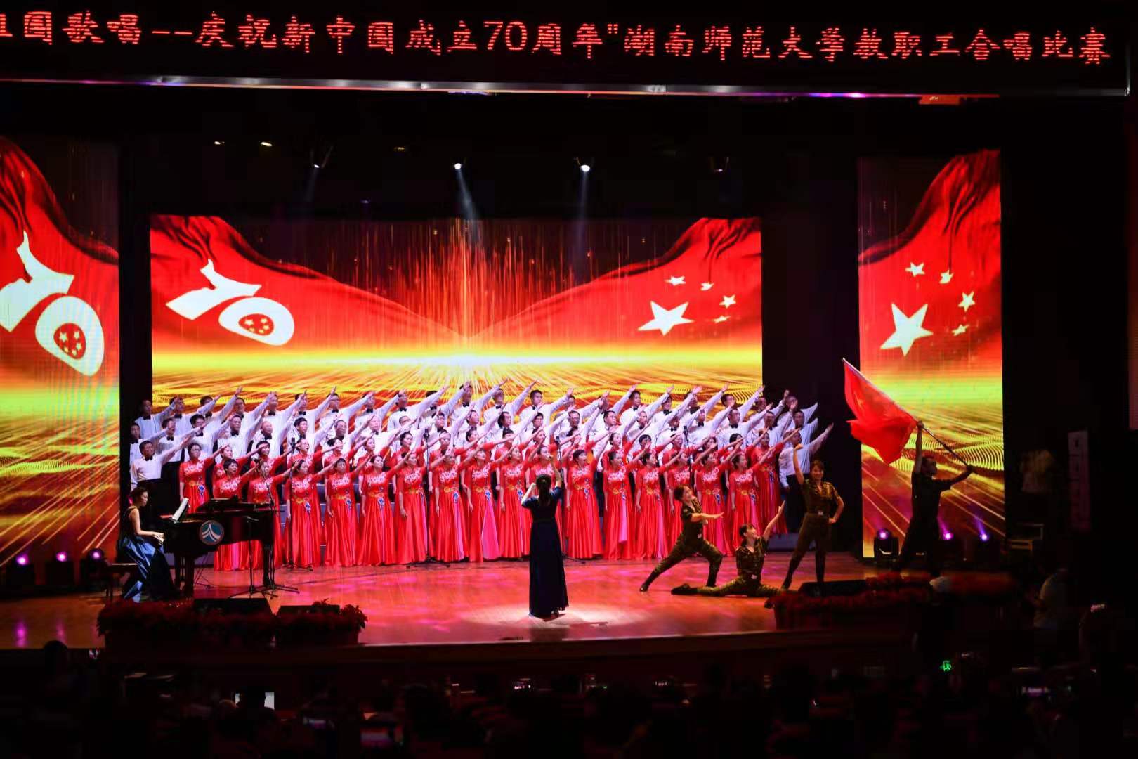 七十年探索与追求,七十年奋进与开拓。2019年9月26日,公司在附中礼堂举行“为祖国歌唱--庆祝新中国成立70周年”全校教职工合唱比赛,活动共有32支队伍,2300多位老师登台演出。公司百余名教职工以歌曲《走向复兴》荣获二等奖。