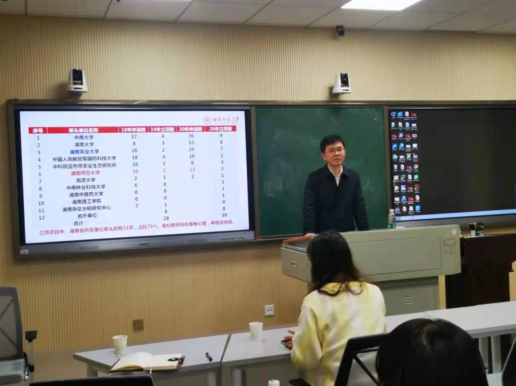 邹永星传达和解读了国家项目申报的相关文件精神,总结了近年来国家项目申报和管理的主要经验和做法,并对青年教师的学术交流、项目培育和过程管理进行具体指导。