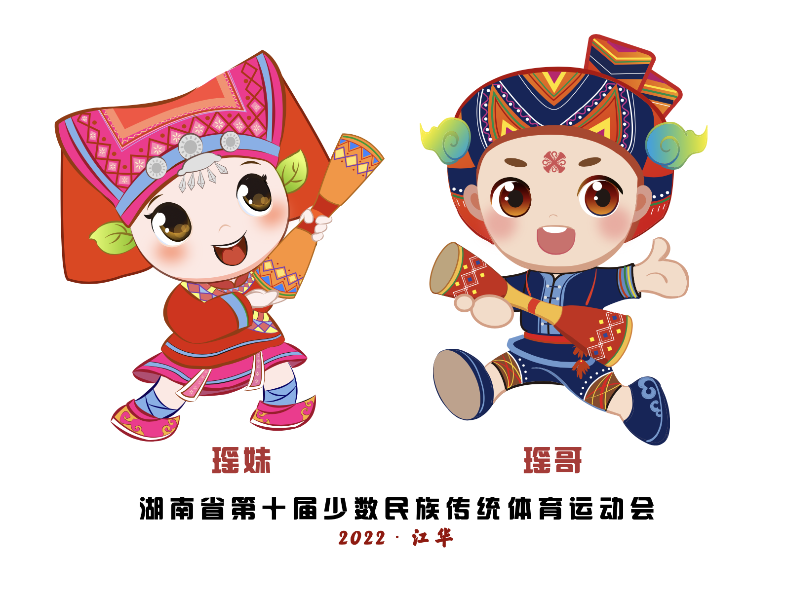 在徐滢洁老师的指导下,赵悰暄和唐文芳以江华瑶族小伙和瑶族小妹为设计原型,塑造了两个手持瑶族特色长鼓,身穿瑶族民族服饰的可爱形象,他们热情洋溢,彰显着神州瑶都江华的地域文化色彩和瑶族人文魅力,传达出本届运动会朝气蓬勃、活力四射、激情迸发、奋发有为的运动精神。