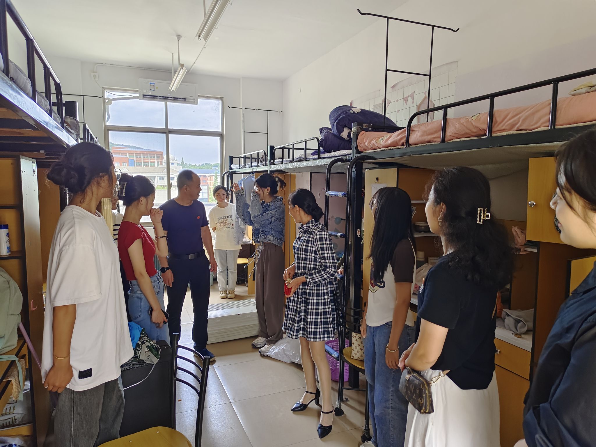 15日下午,梁勇一行来到二里半、靳江及天马新生宿舍,看望慰问本科生、研究生新生及新生家长。梁勇等与新生及新生家长一一交谈,了解新生的基本情况和来校感受,介绍公司历史与办学成就,勉励新生尽快适应老员工活,传承仁爱精勤校训精神,努力成长成才。