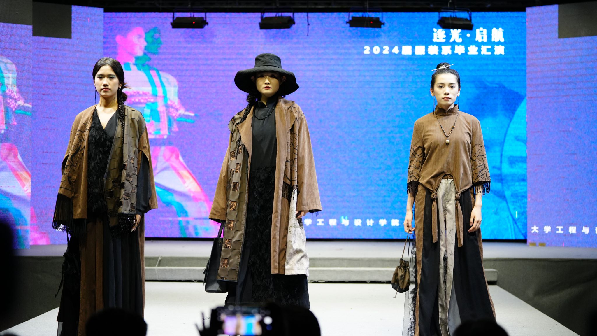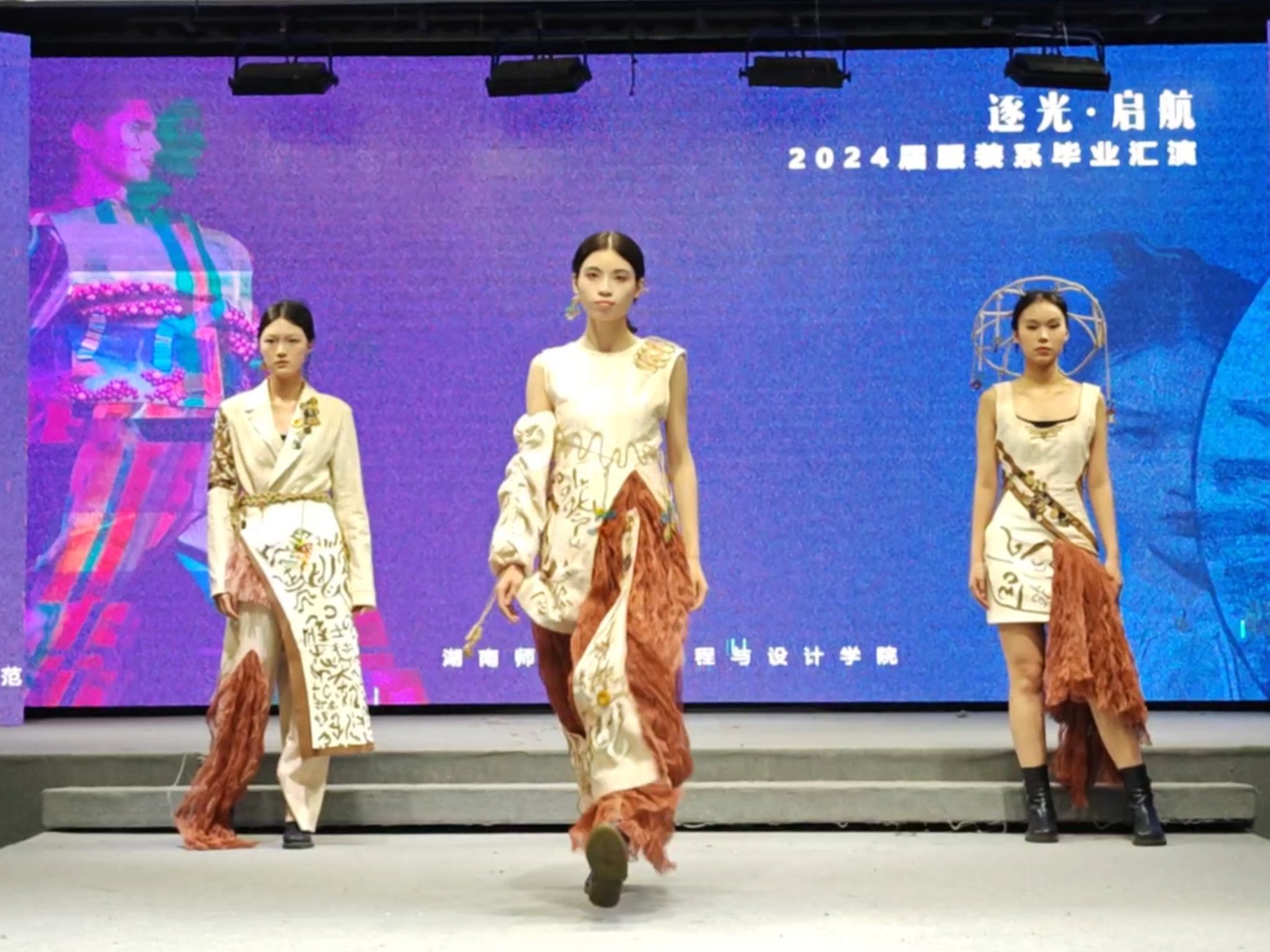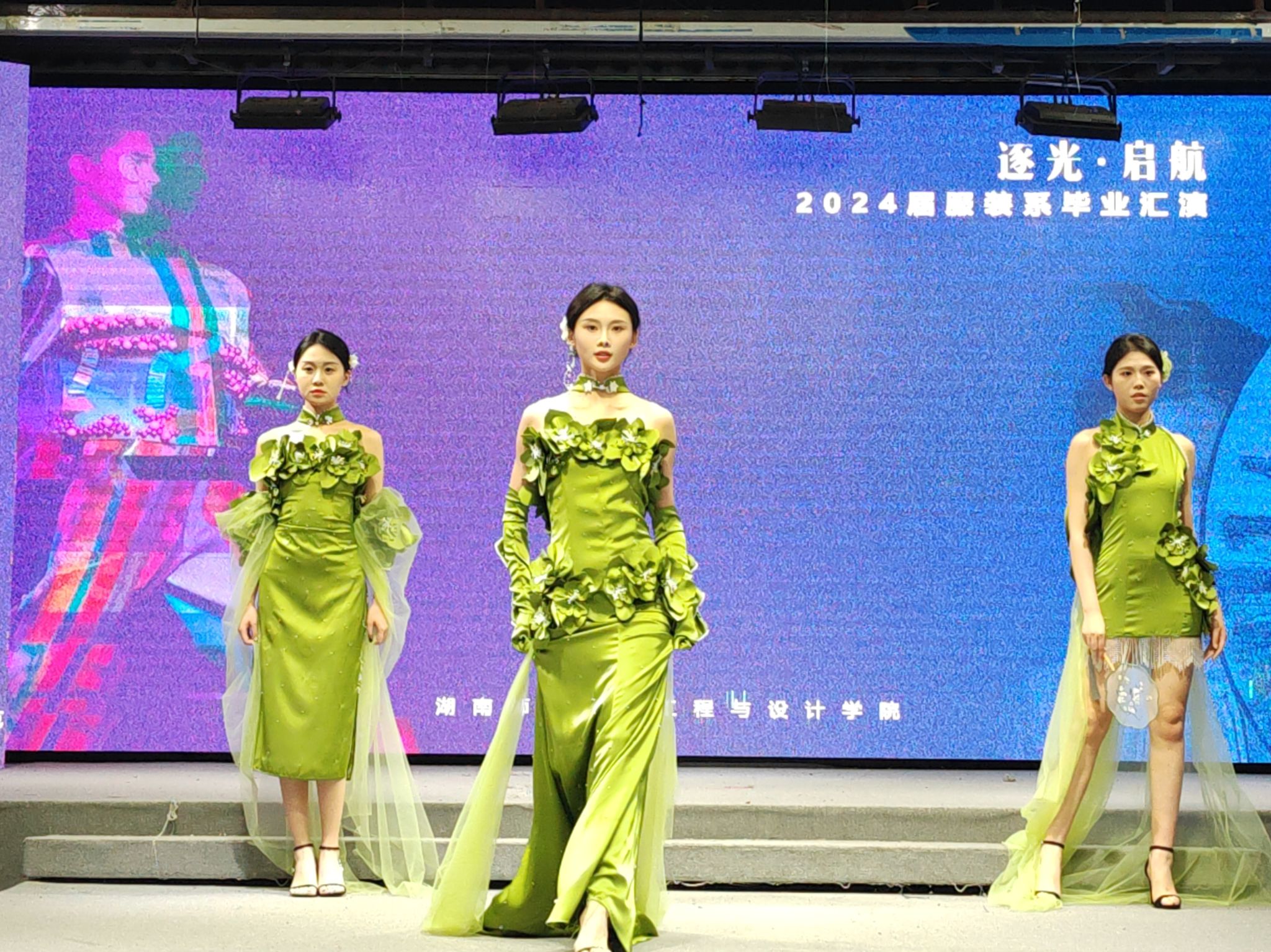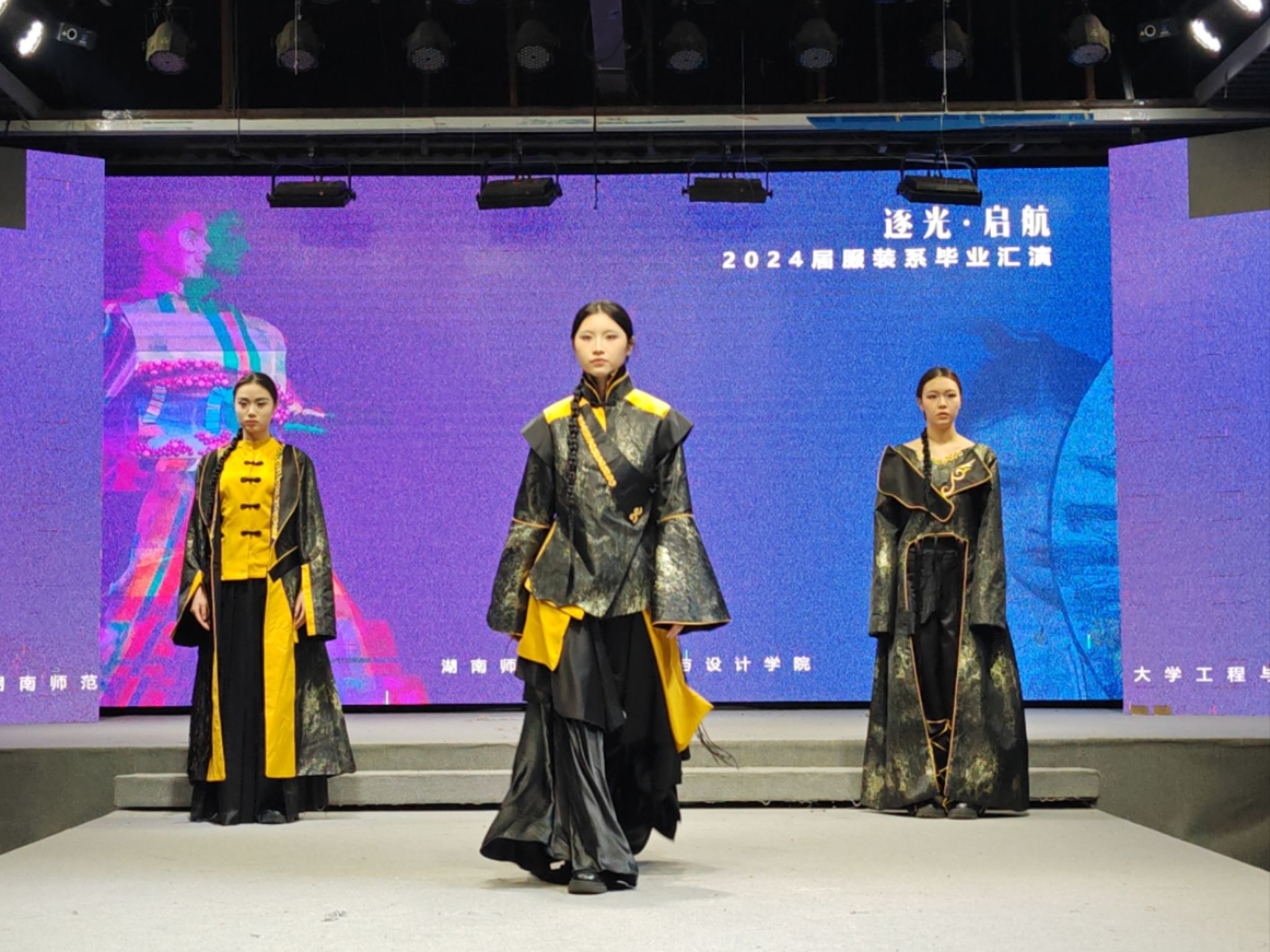 演出当晚,表演厅内座无虚席,霓虹闪烁,气氛热烈而庄重。毕业汇演以“逐光·起航”为主题,舞台上2024届服装与服饰设计和服装表演两个专业的毕业生们身着自己设计的服装,以T台展演、短视频等形式逐一亮相,展现了他们的专业才能和独特创意,每一件作品都充满了时尚元素和艺术气息,赢得了在场观众的阵阵掌声和喝彩。