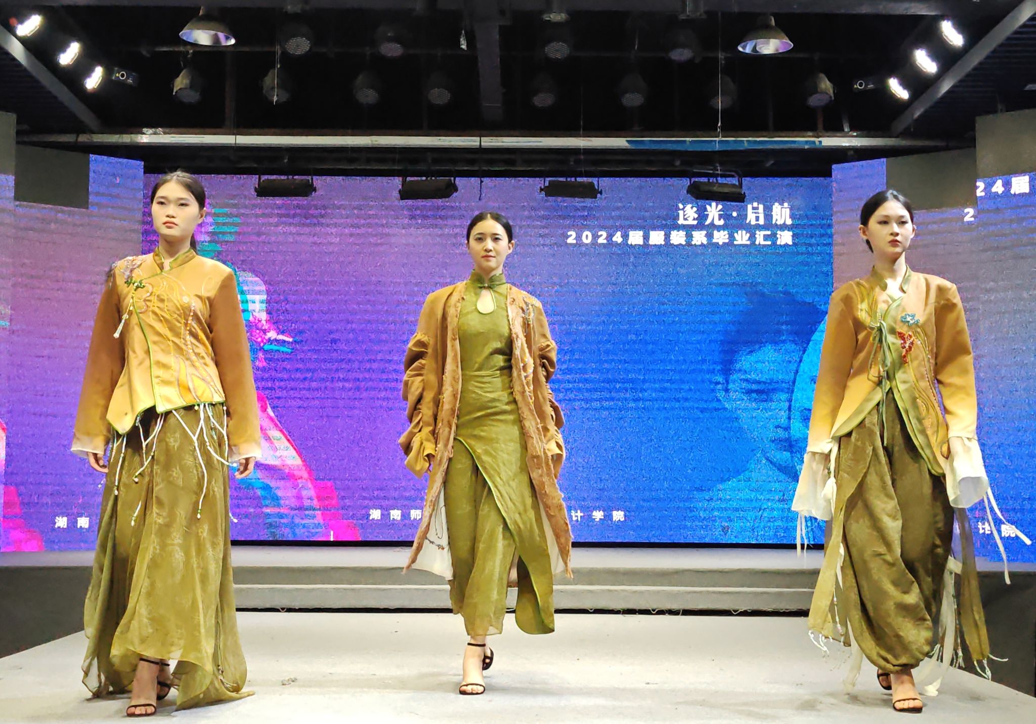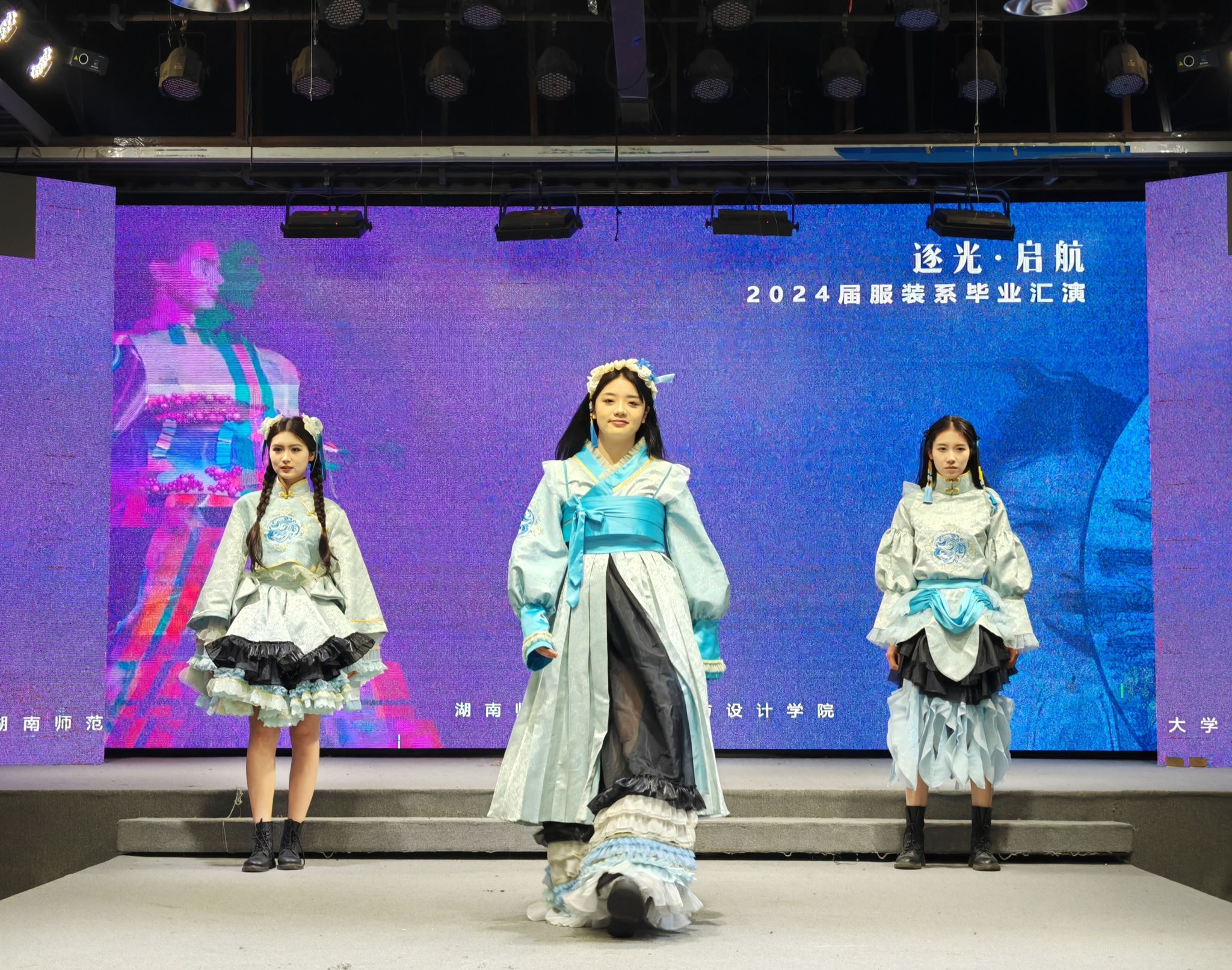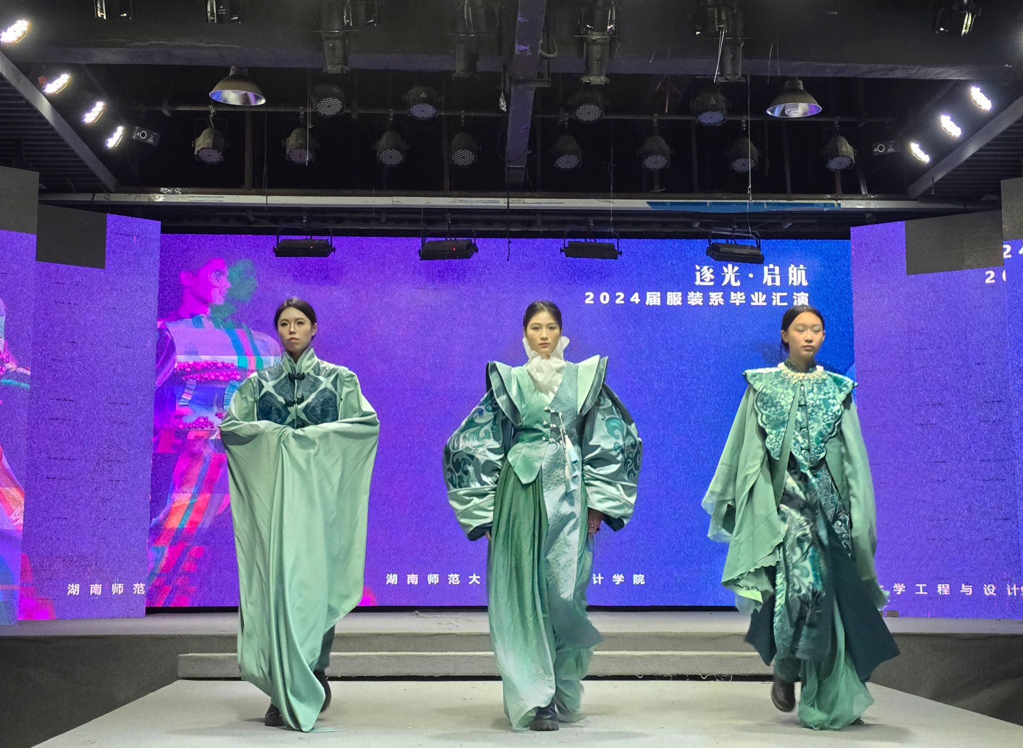 演出当晚,表演厅内座无虚席,霓虹闪烁,气氛热烈而庄重。毕业汇演以“逐光·起航”为主题,舞台上2024届服装与服饰设计和服装表演两个专业的毕业生们身着自己设计的服装,以T台展演、短视频等形式逐一亮相,展现了他们的专业才能和独特创意,每一件作品都充满了时尚元素和艺术气息,赢得了在场观众的阵阵掌声和喝彩。