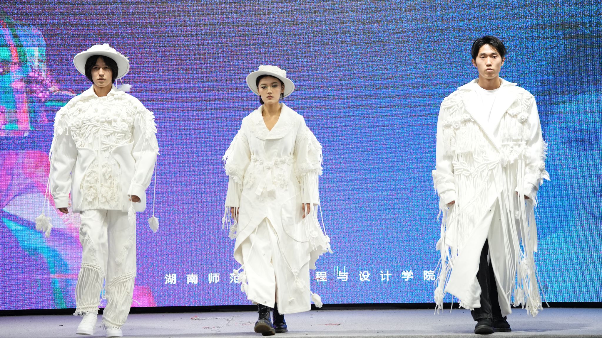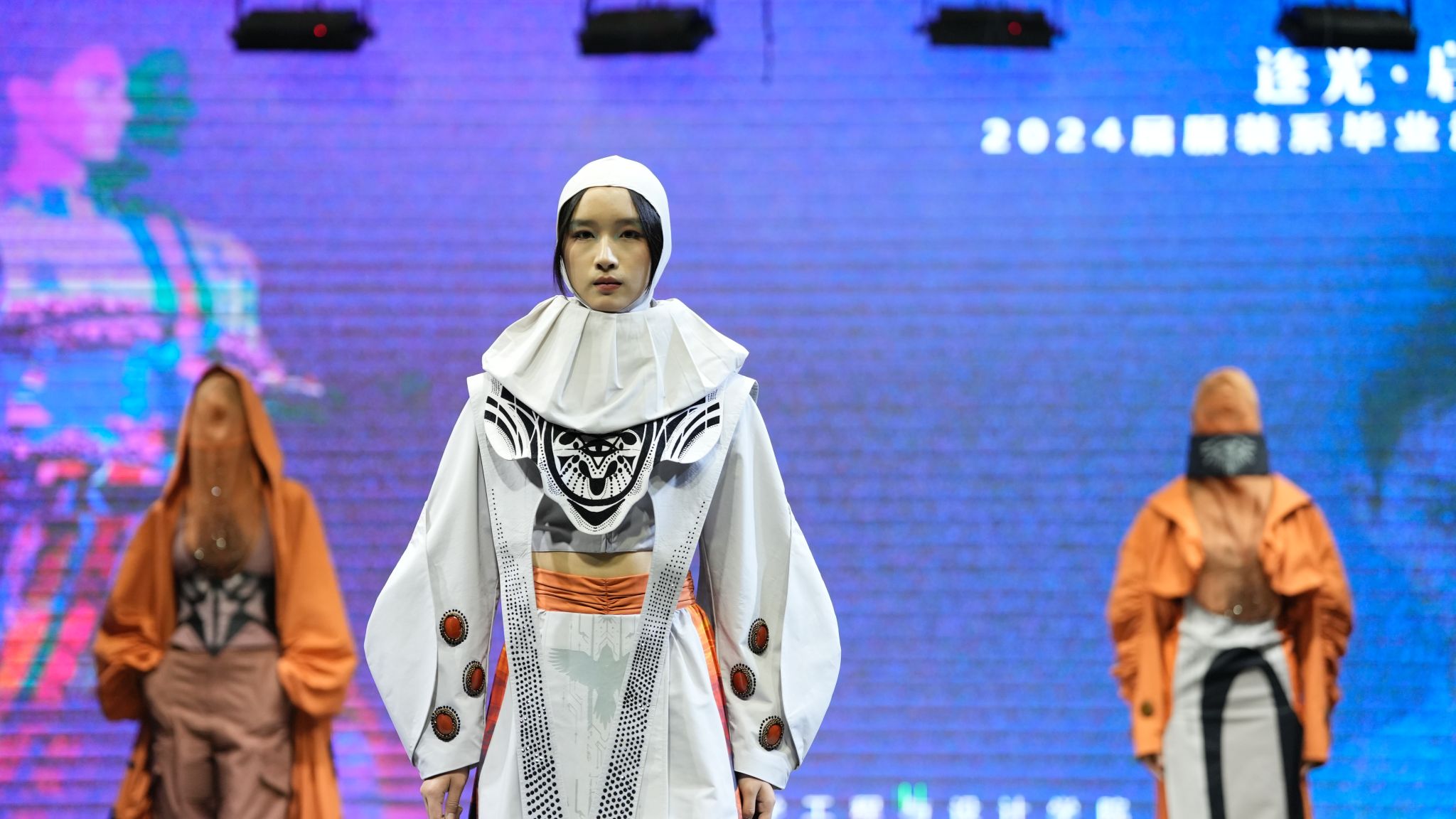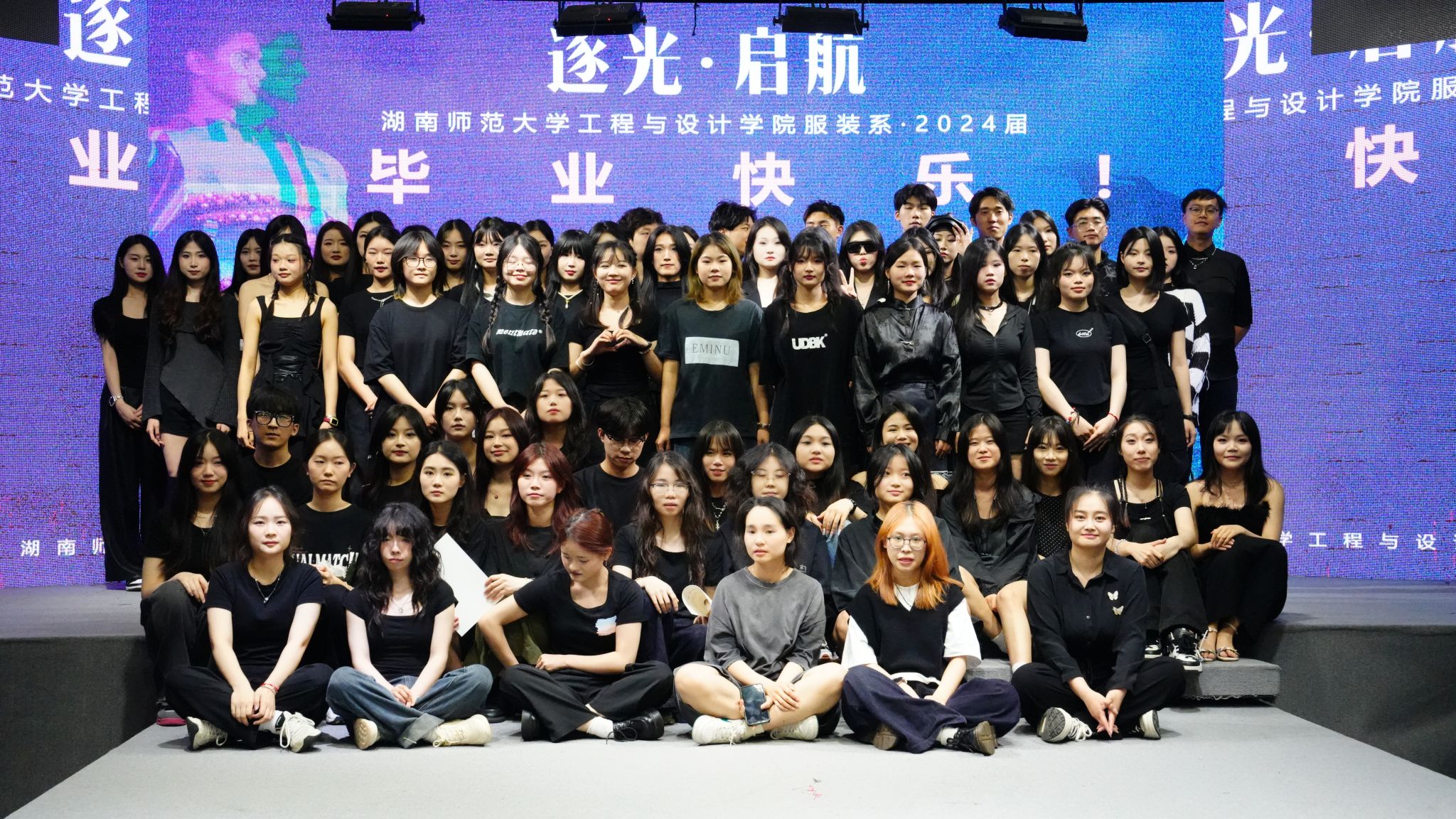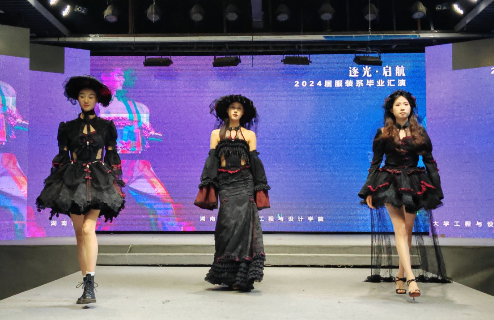 演出当晚,表演厅内座无虚席,霓虹闪烁,气氛热烈而庄重。毕业汇演以“逐光·起航”为主题,舞台上2024届服装与服饰设计和服装表演两个专业的毕业生们身着自己设计的服装,以T台展演、短视频等形式逐一亮相,展现了他们的专业才能和独特创意,每一件作品都充满了时尚元素和艺术气息,赢得了在场观众的阵阵掌声和喝彩。