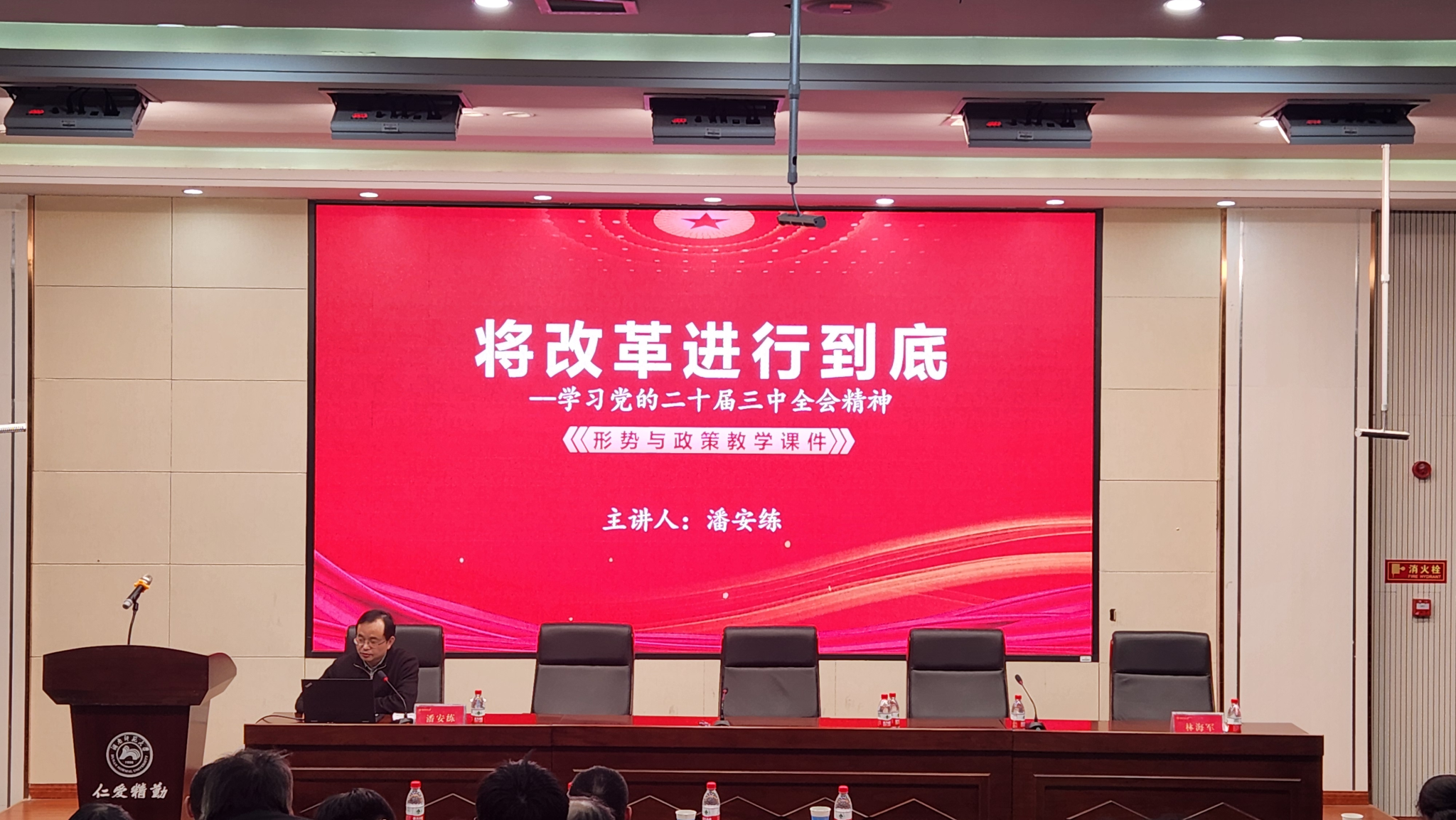 (通讯员:申梦博)12月19日下午,公司潘安练副董事长受邀为公司全体教职员工和本科生代表宣讲党的二十届三中全会精神暨讲授形势与政策课程。公司党委书记梁勇主持。