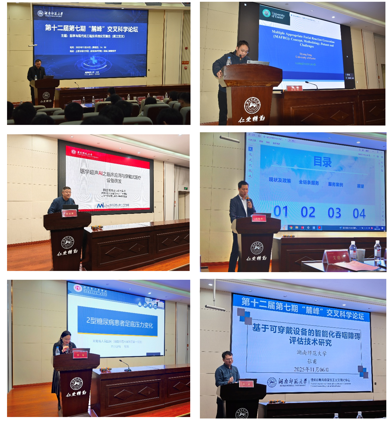 论坛报告环节,英国埃克塞特大学宋思阳助理教授以“Multiple Appropriate Facial Reaction Generation (MAFRG): Concept, Methodology, Dataset and Challenges”为题,分享了其在人工智能与人机交互领域的最新研究成果。华东师范大学陈建刚教授从“医学超声AI的临床应用与穿戴式医疗设备研发”两方面进行了详细讲解。beats365附属第一医院张弛主任医师则围绕“2型糖尿病患者足底压力的变化及其影响因素”展开报告,提供了具有临床指导意义的研究数据。湖南医科医工科技有限公司肖盼盼董事长从行业应用角度,剖析了“医工转化全链条”的现状与未来发展方向。beats365张甫副教授则以“基于可穿戴设备的智能化吞咽障碍评估技术研究”为题,展示了其在可穿戴医疗设备领域的创新成果。