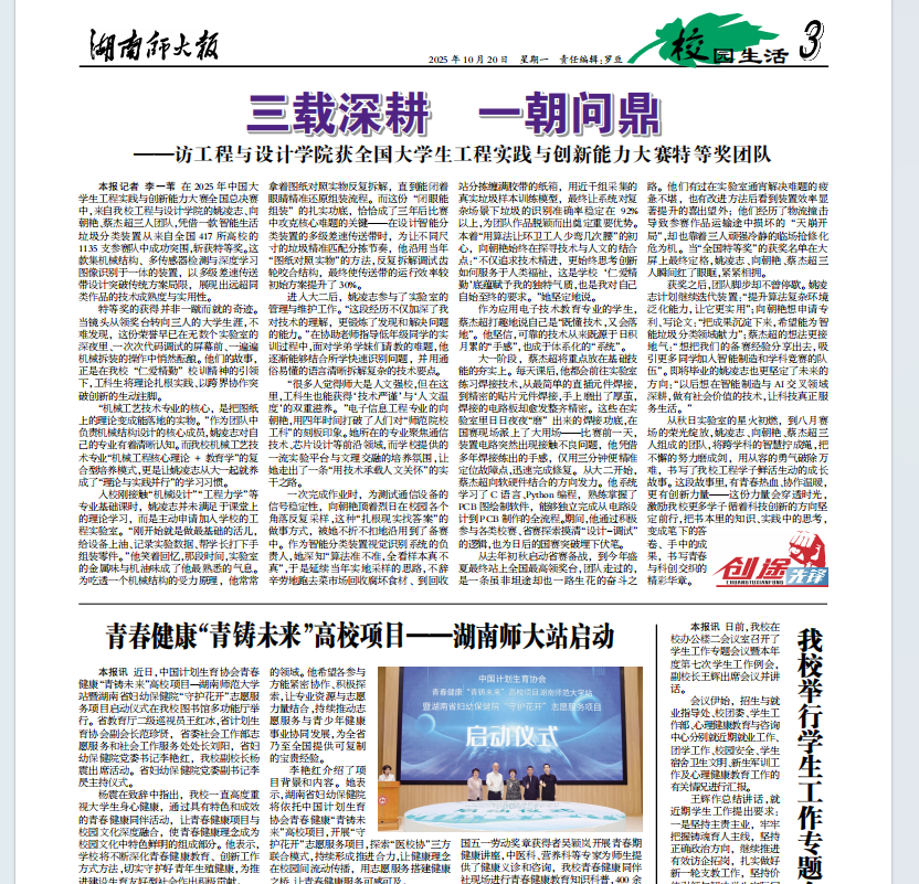 荣誉等身,团队脚步却不曾停歇。姚凌志计划继续迭代装置:“提升算法复杂环境泛化能力,让它更实用”;向朝艳想申请专利、写论文:“把成果沉淀下来,希望能为智能垃圾分类领域献力”;蔡杰超的想法更接地气:“想把我们的备赛经验分享出去,吸引更多同学加入智能制造和学科竞赛的队伍”。即将毕业的姚凌志也更坚定了未来的方向:“以后想在智能制造与AI交叉领域深耕,做有社会价值的技术,让科技真正服务生活。”