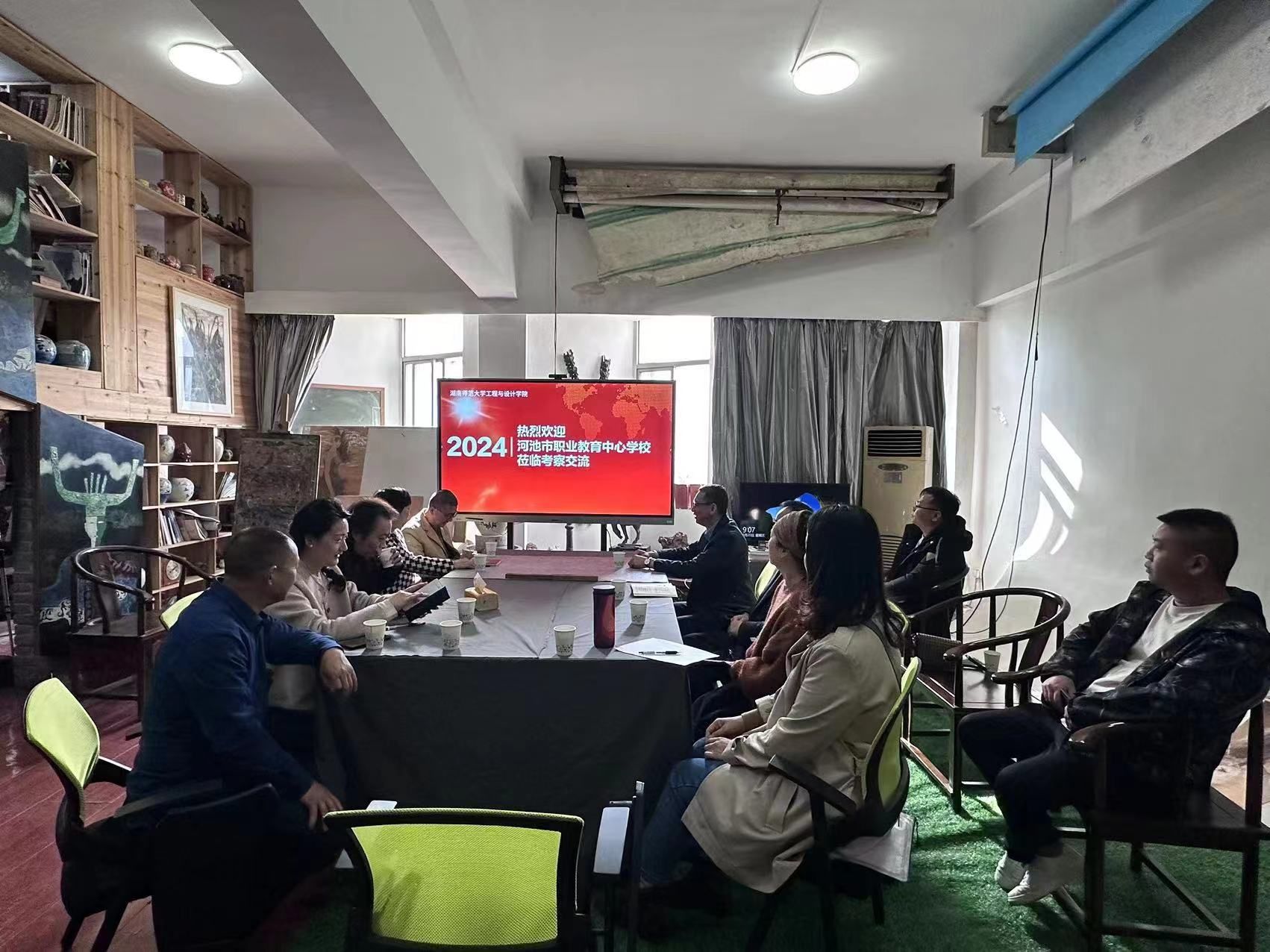 谭冠著介绍了河池职业教育中心公司的基本情况。双方就中职教育发展困惑、非遗传承保护如何进入中职教育以及公司产品、校企合作等问题进行交流探讨。