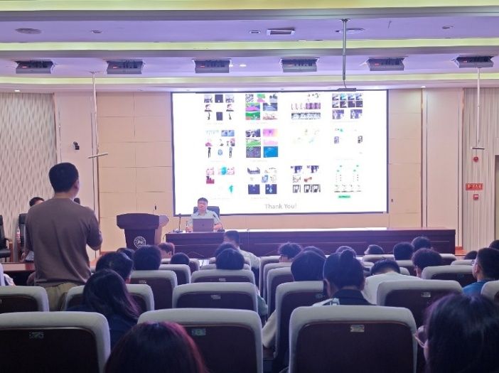 唐博士就如何让机器依据不同指导形式生成人脸、手部、身体和自然场景的图片(如面部标志、分割地图或人体骨架等)进行了详细讲解,并对如何结合文本、音频、图片、视频和3D对象等多模态信息来构建“AI生成系统”的未来研究计划进行了简要介绍。提问环节,同学们积极思考、踊跃提问,就图像合成和多模态合成中的一些细节,及如何规划开展学术研究等问题向唐浩员工请教。此次讲座氛围轻松,思维发散,内容丰富,师生受益良多。
