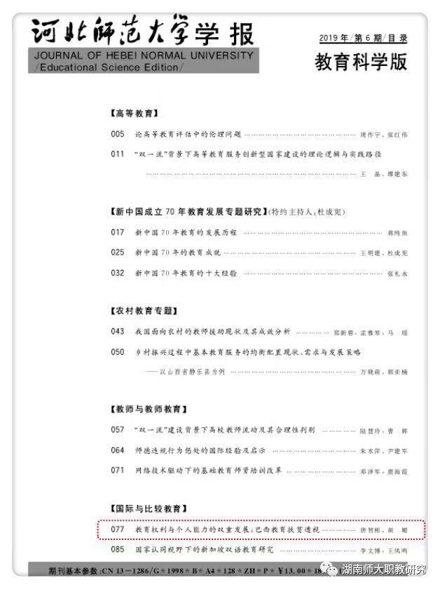 beats365职业教育研究所副教授唐智彬博士与研究生胡媚在《河北师范大学学报(教育科学版)》2019年第6期发表论文《教育权利与个人能力的双重发展:巴西教育扶贫透视》。该文是2019年度教育部人文社会科学研究规划基金项目“职业教育扶贫的国际经验与中国路径研究”的阶段性成果,主持人为唐智彬。论文聚焦巴西教育扶贫,通过对其基本框架与思路、一系列行动计划的深入分析,从教育权利和个人能力双重增长的角度,总结出巴西教育扶贫的重要经验与实践反思,并提出了对我国教育扶贫的启示。