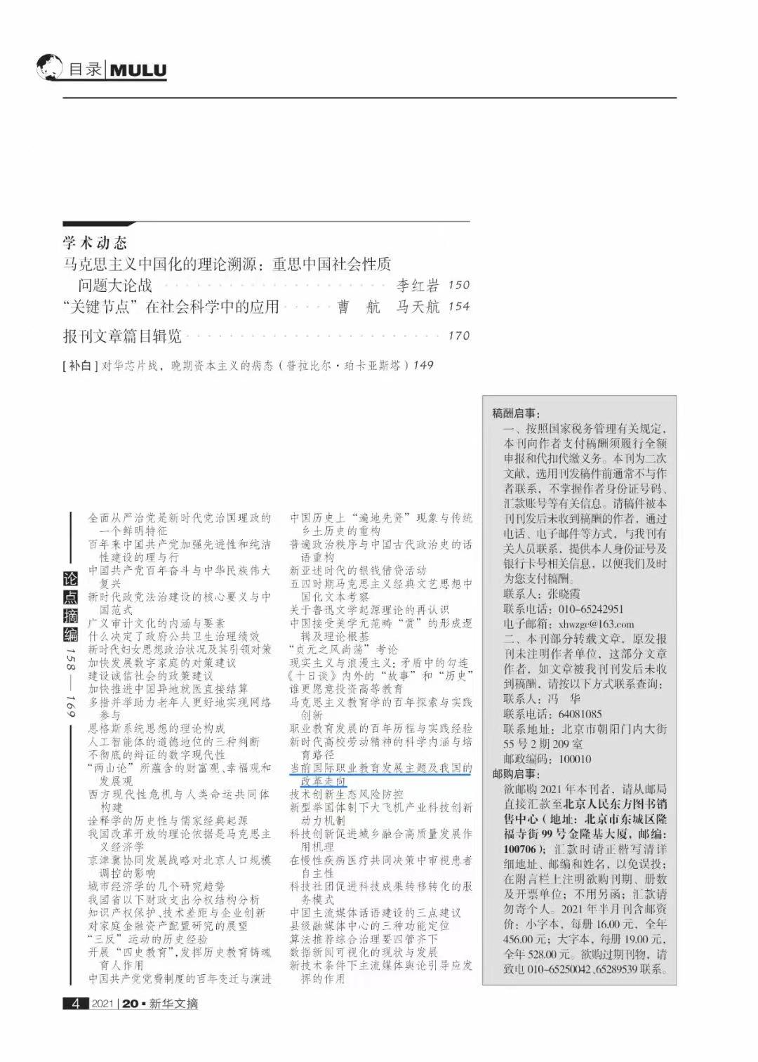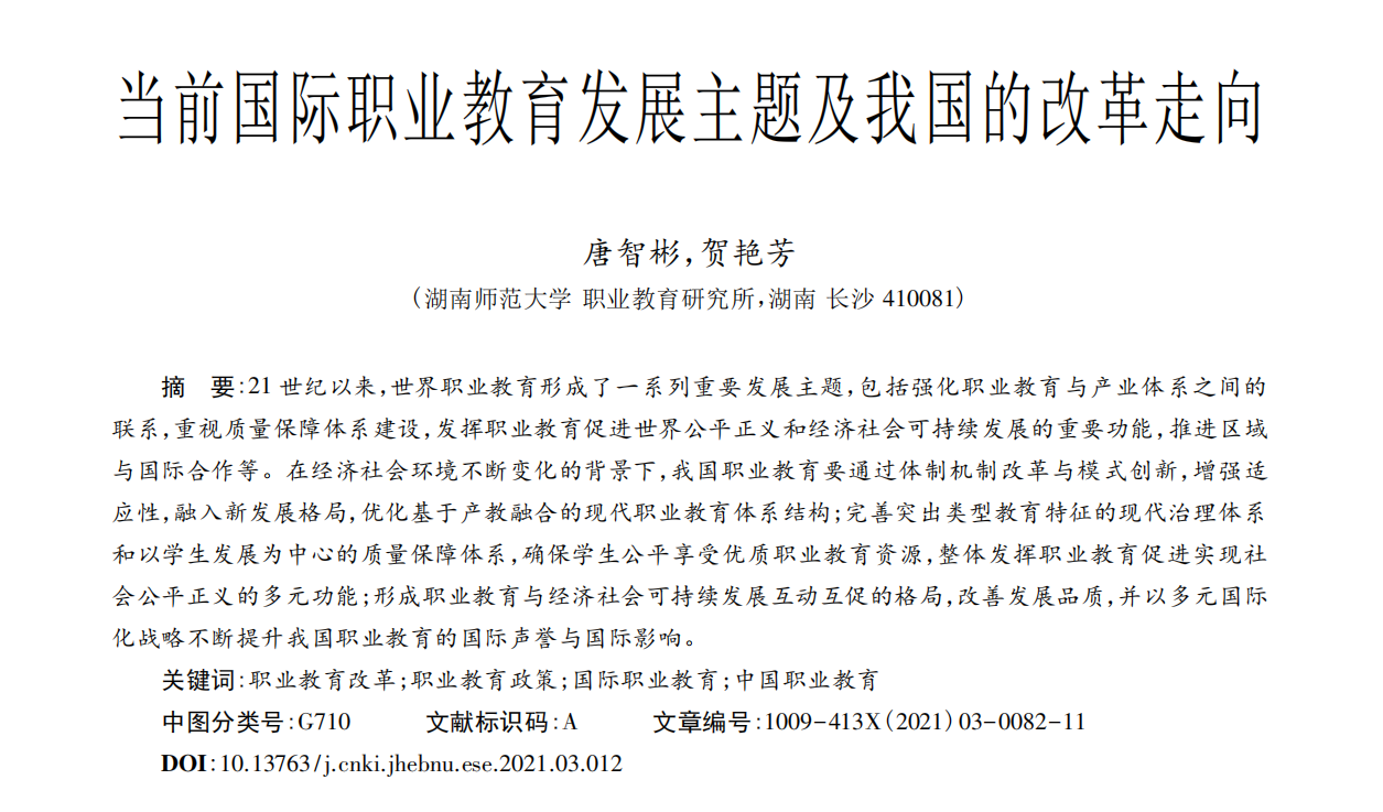 近期,我所研究成果《当前国际职业教育发展主题及我国的改革走向》被人大复印报刊资料《职业技术教育》2021年第11期全文转载,并被《新华文摘》第20期“论点摘编”栏目选摘。该成果原发表于《河北师范大学学报教育科学版》2021年第3期,由唐智彬教授和贺艳芳博士完成,是湖南省哲学社会科学基金一般资助项目的阶段性研究成果。
