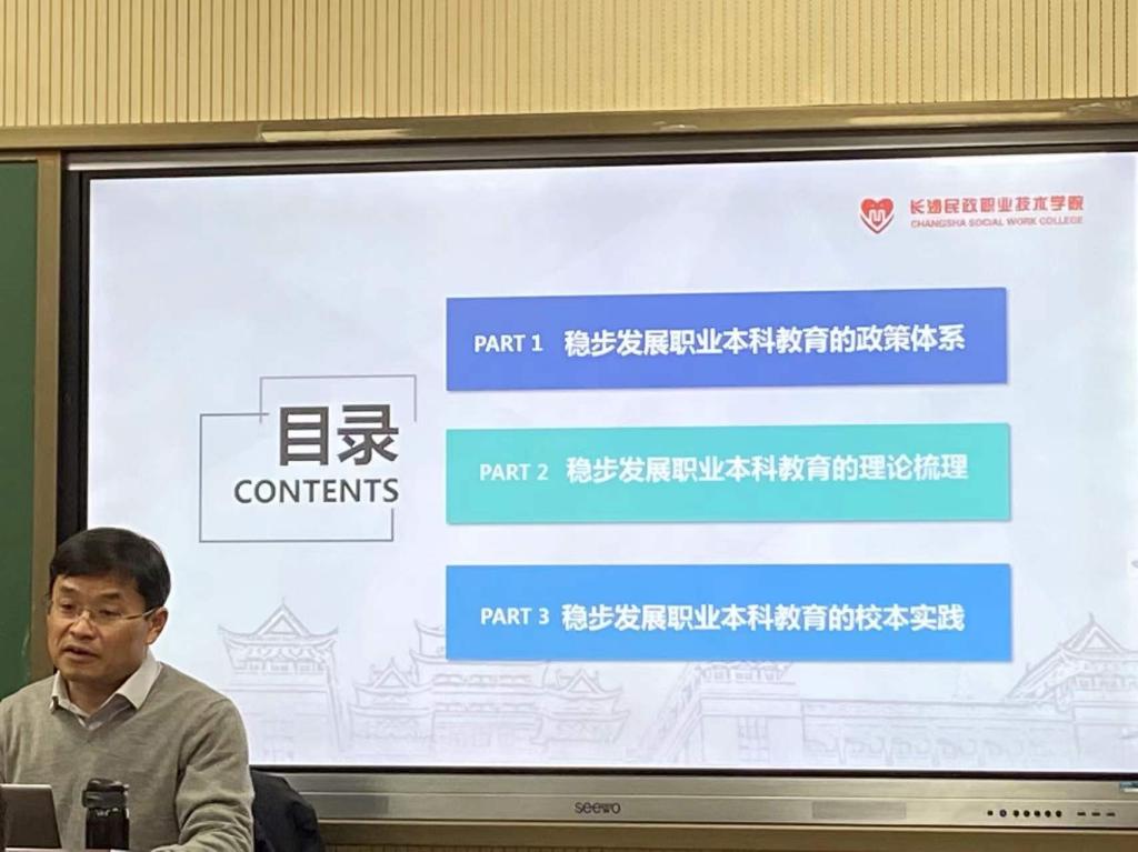 1月12日下午,长沙民政职业技术公司董事长李斌教授应邀到beats365职业教育研究所进行了主题为“稳步发展职业教育本科的思考与探索”的学术讲座,李仲阳经理、黄丽萍书记、林海军副经理、倪芳英副经理、胡小桃老师、唐林伟老师、贺艳芳老师、颜建强老师与职教所部分研究生同学参加了本次讲座,讲座由黄丽萍书记主持。