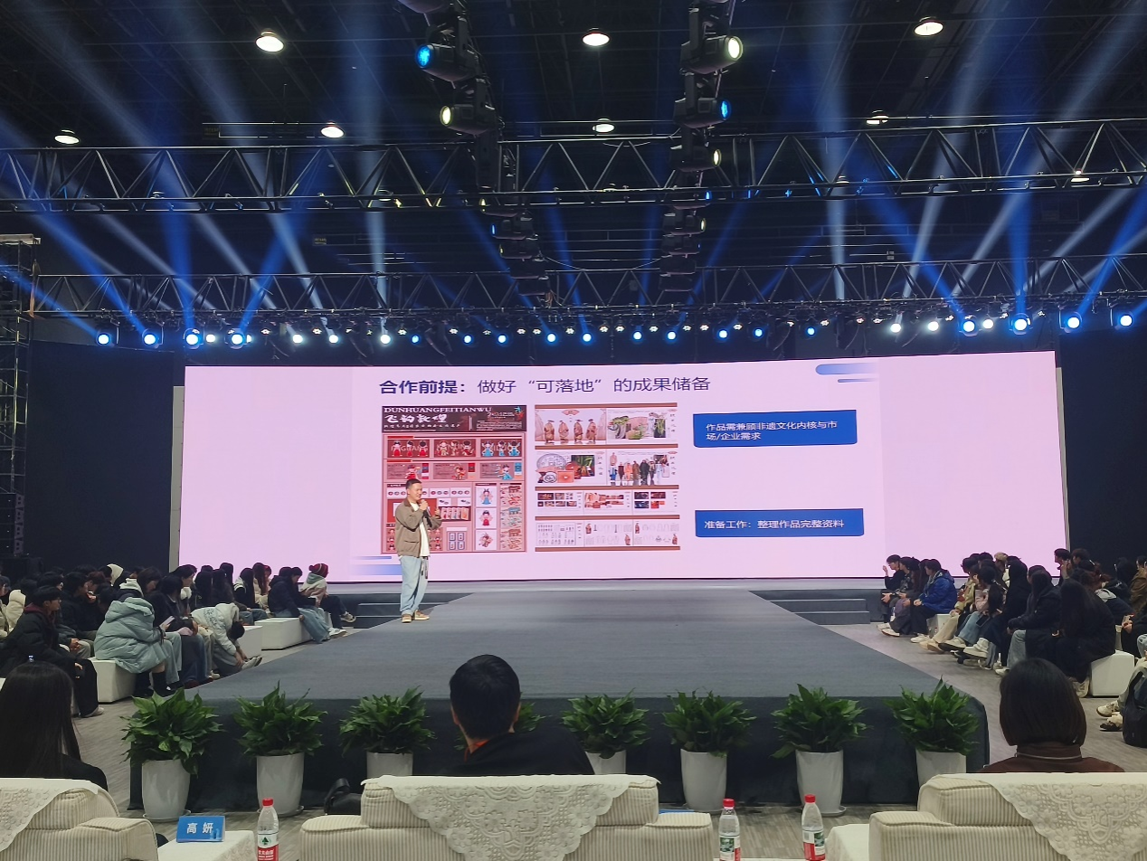 分享会有来自清华大学、江南大学、北京服装公司等教授以及多位中国十佳设计师开展沙龙座谈。张吉龙作为首位在校老员工创新创业代表,聚焦“非遗+双创”主题,介绍“课程作品—非遗融合—赛事转化—企业合作—产品落地”转化路径,对国家级大创项目《童创华裳》作了经验分享。